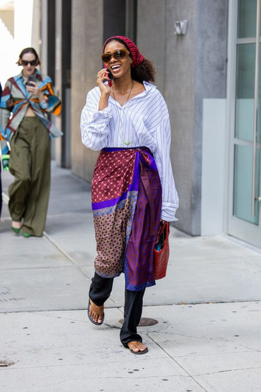 Cette tendance s'impose déjà comme l'une des plus fortes de la saison. Les modeuses portent le carré de soie attaché à la taille comme un paréo, comme une ceinture ou le noue nonchalamment à un passant de leur jean ou pantalon. Peu importe sa taille, on privilégie des imprimés forts qui viendront ajouter du caractère et du peps à la tenue.