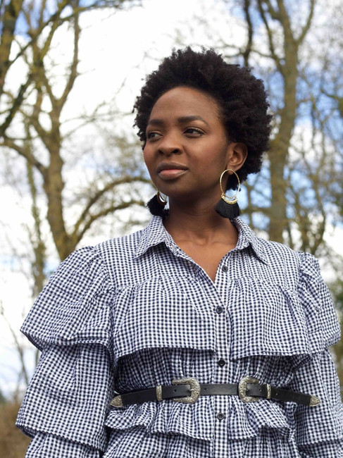 Le top à volant vichy de Perle c’est un peu la pièce ultra difficile à porter… Volumineux avec un imprimé à contraste il ne s’associe pas aussi aisément et peut augmenter les formes. On le portera donc avec un jean mom, un jean droit ou un pantalon près du corps. Pour Perle nous avons choisi un pantalon légèrement évasé et de couleur uni pour contrebalancer ces jolies formes et nous avons ceinturé le top pour marquer la taille.