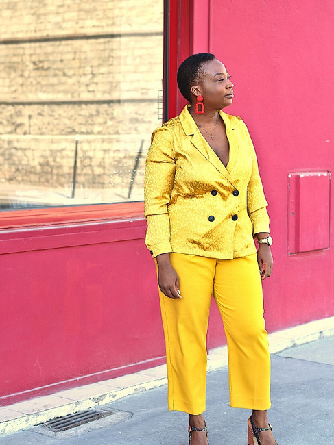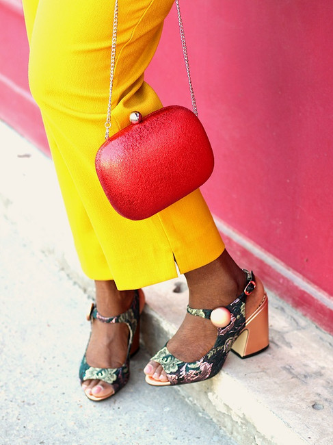Le total look est toujours une bonne idée si vous aimez les couleurs mais n'osez pas les mixer ! Un tailleur ou des vêtements dans les mêmes teintes vous permettront de porter de la couleur plus facilement. Cette saison, on opte pour le total look brun ou le total look rouille (même si le total look en simili cuir noir ou encore le très populaire tailleur rose sont bien plus populaires). Au niveau accessoire, notre deuxième coup de cœur chaussures, cette paire de sandales à motif tapisserie avec le détail du bouton et du talon en or rose, tellement Miu Miuesque (et vous n'êtes plus sans ignorer notre amour pour Miu Miu) apporte de l'originalité à la tenue, ainsi qu'une minaudière rouge métallisé. Plutôt que d'ajouter des boucles d'oreille dorées qui auraient été éclipsées par le chemiser jaune, nous avons choisi des boucles d'oreille rouges... pour éviter d'en faire trop ! Hahaha ! Ce look est le préféré d'Imelda et nous l'avons donc shooté en dernier car c'est souvent à ce moment là que le papillon sort de sa chrysalide. Et quelle chrysalide, comme beaucoup de femmes, Imelda a ses complexes et nous étions ravies de l'aider à les oublier grâce à de simples conseils vestimentaires.