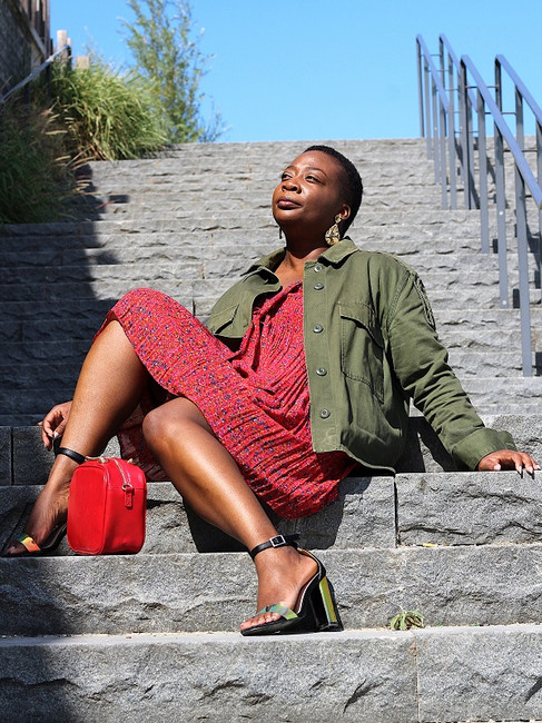 Pour le coup nous on souhaitait montrer à Imelda qu'elle peut casser le côté girly de la robe avec une pièce plus masculine comme la veste militaire kaki, comme vu chez Miu Miu AH2019 d'ailleurs. Le kaki qui est une nuance de vert se marient parfaitement avec le rouge qui est son complémentaire, n'hésitez pas à marier ces deux couleurs. Pour finir le look nous avons ajouté une paire de sandales modernes et sexy avec un talon doré aux effets holographiques et un sac rouge. Imelda ayant les cheveux courts, on a ajouté de grosses boucles d'oreille dorées pour habiller le visage et le féminiser.